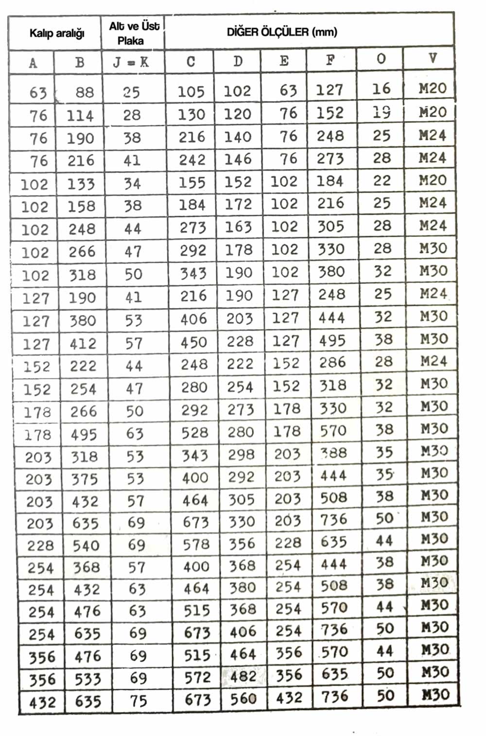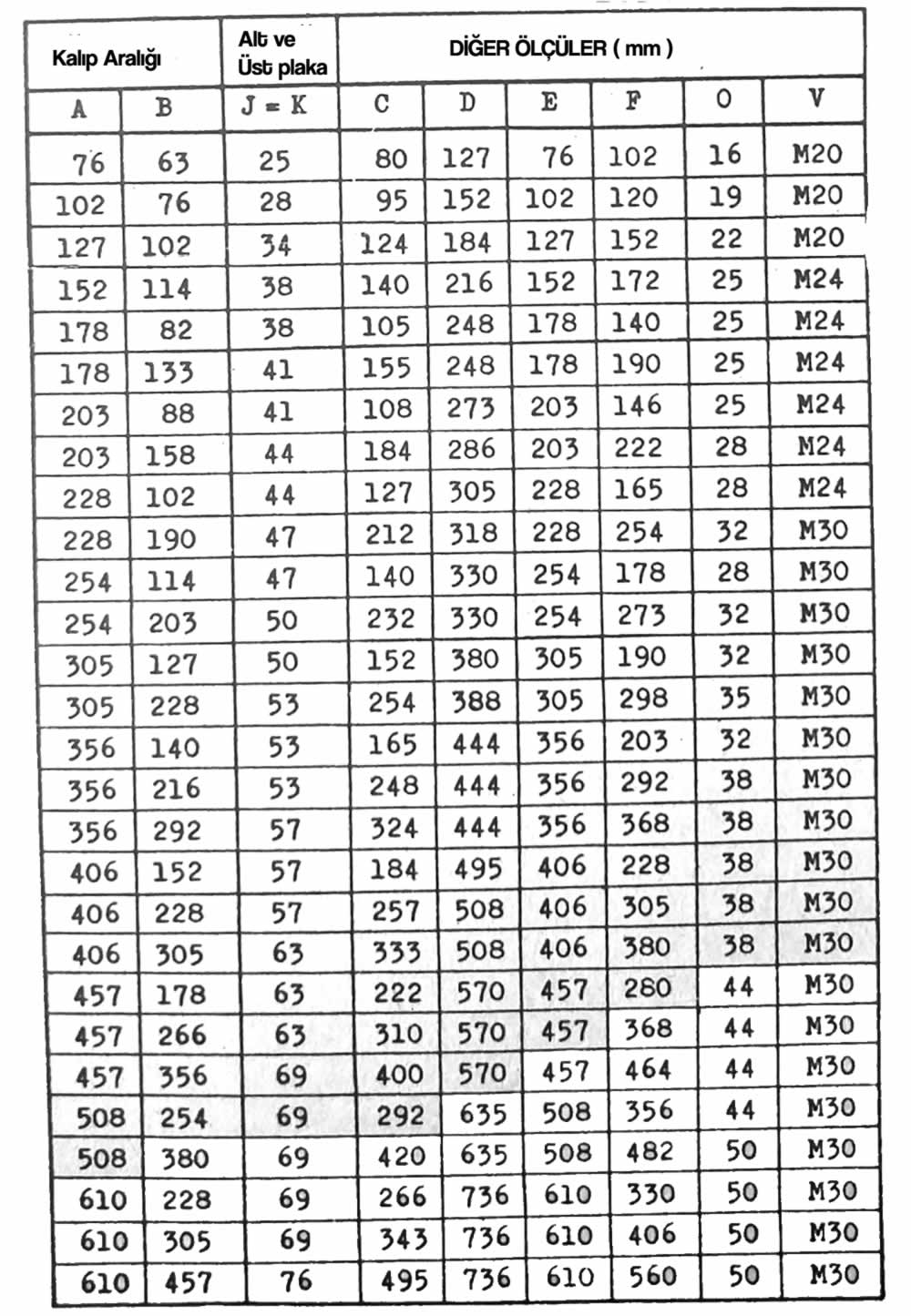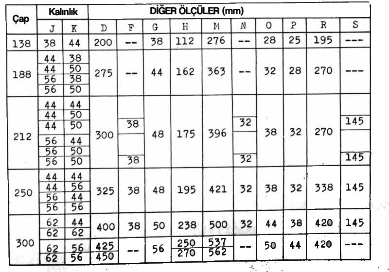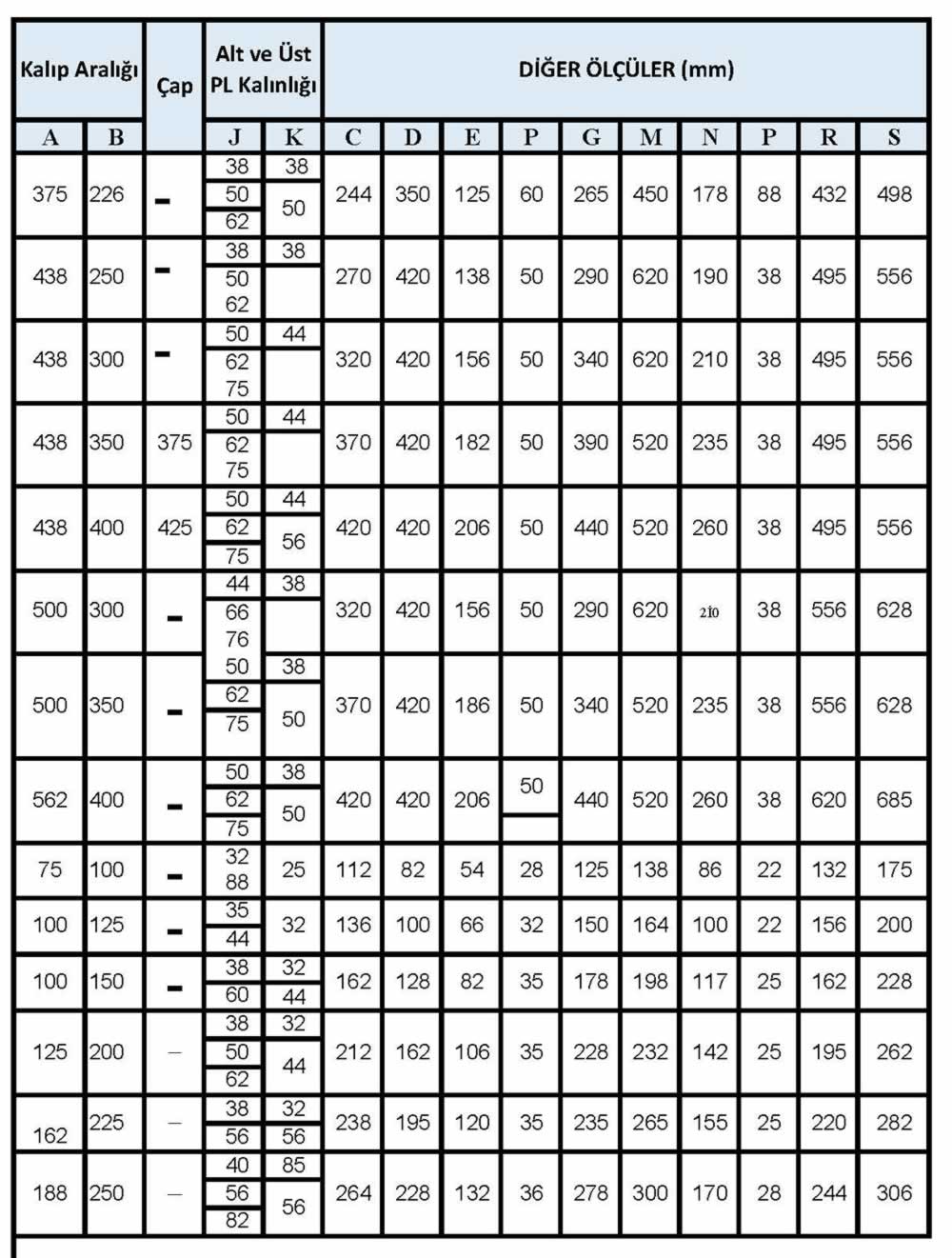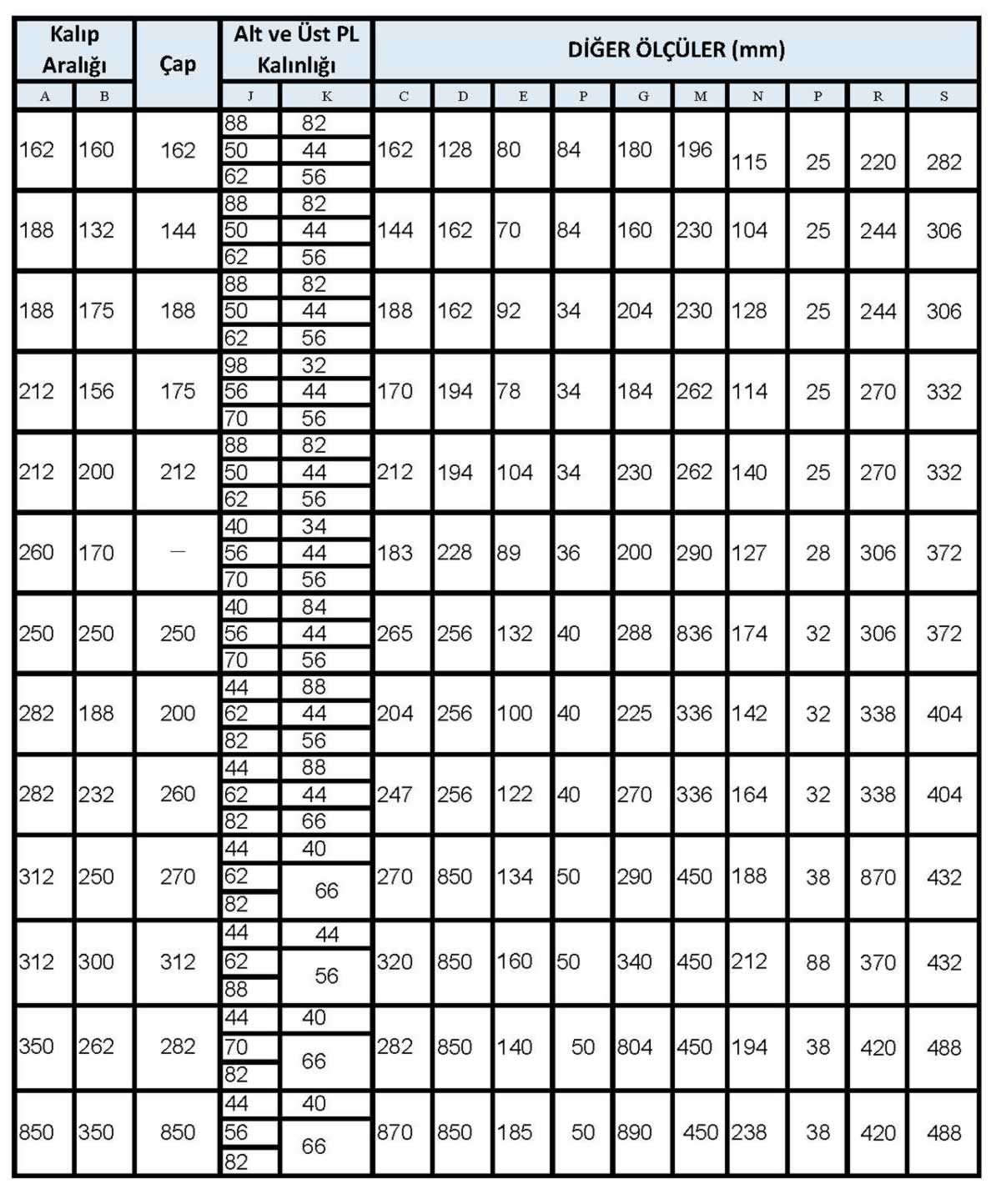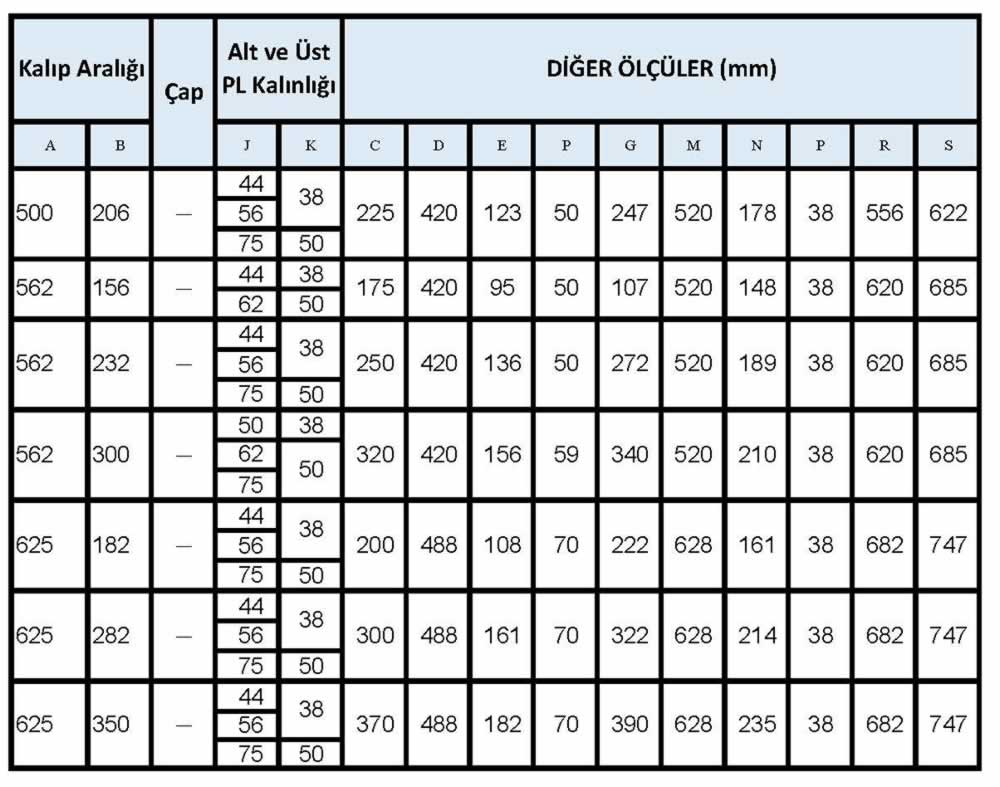 Açık yuvarlak kalıp seti ölçüleri tablosu- mm (yukarıda)