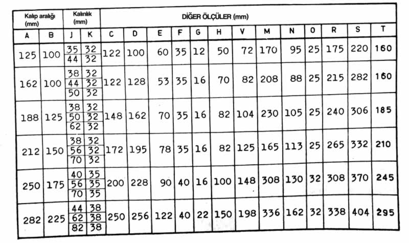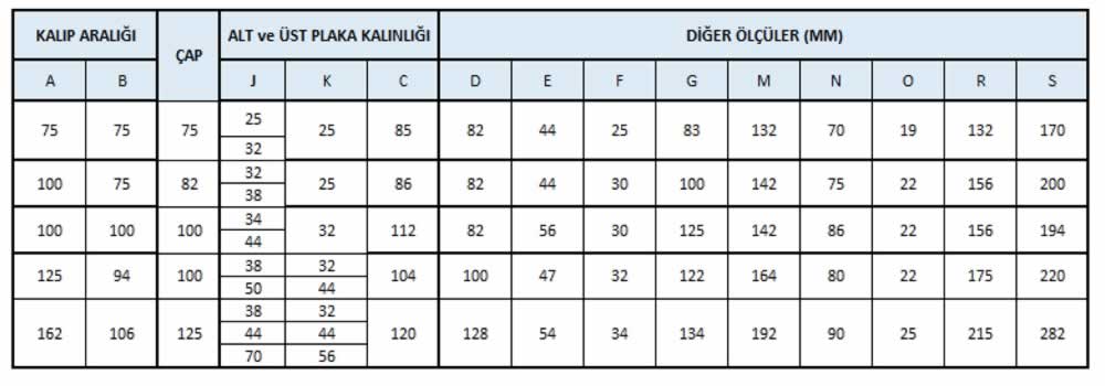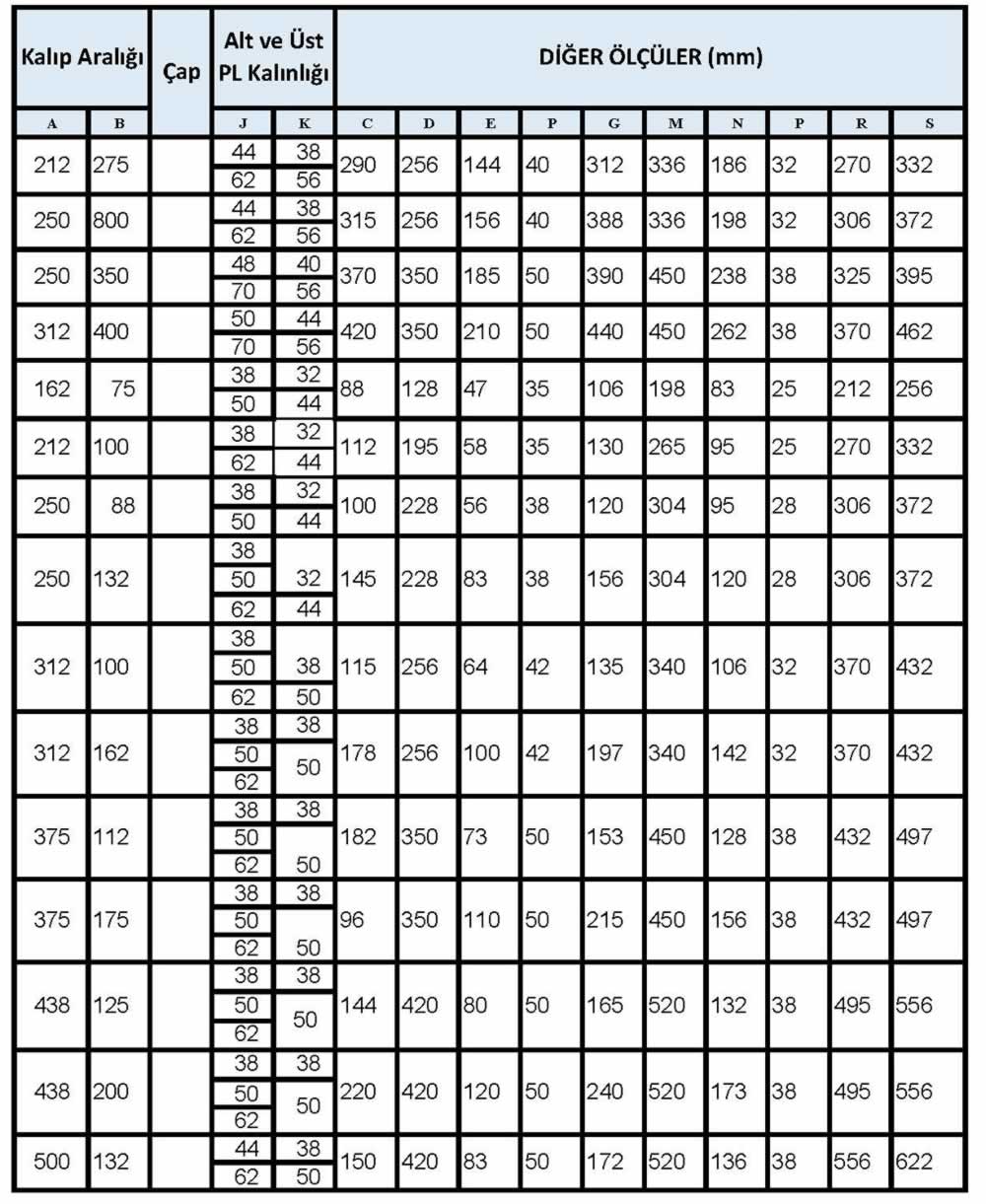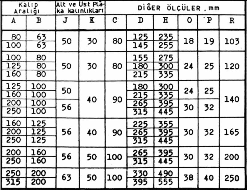 Standard sütunlu kalıp seti tipleri aşağıdaki özellikleri taşımaktadır;
